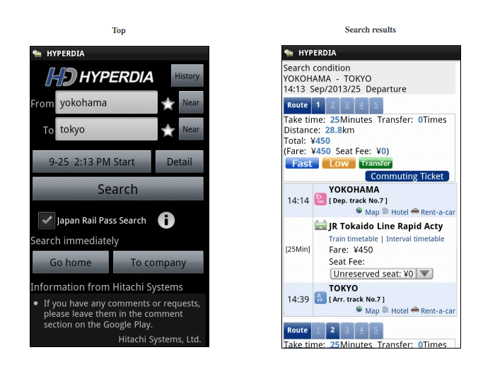 Una volta inserito il punto di partenza e il punto di arrivo, Hyperdia consiglia il percorso ottimale, nonché informazioni sui prezzi dei biglietti e i binari a cui recarsi.