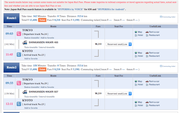 Vi consiglio di consultare Hyperdia prima di partire, in modo da avere un’idea dei treni da prendere, del tempo di percorrenza e se le vostre tratte sono coperte dal japan rail pass.