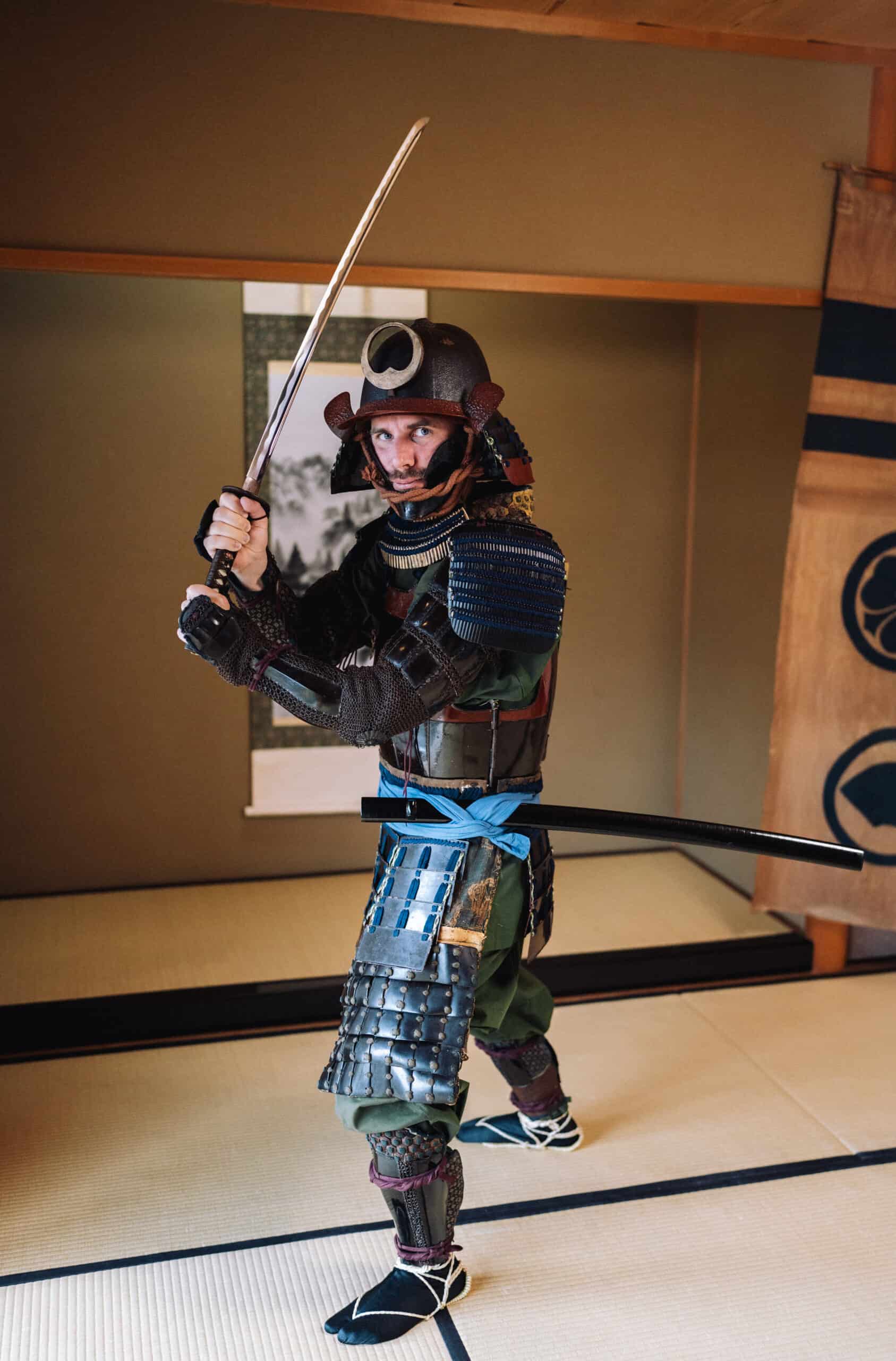 - Prima dell’elmetto (kabuto), ti insegneremo alcune posizioni base di difesa e attacco con una katana da allenamento (non affilata, ma decorata con accessori autentici del 1600);